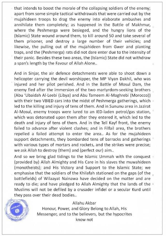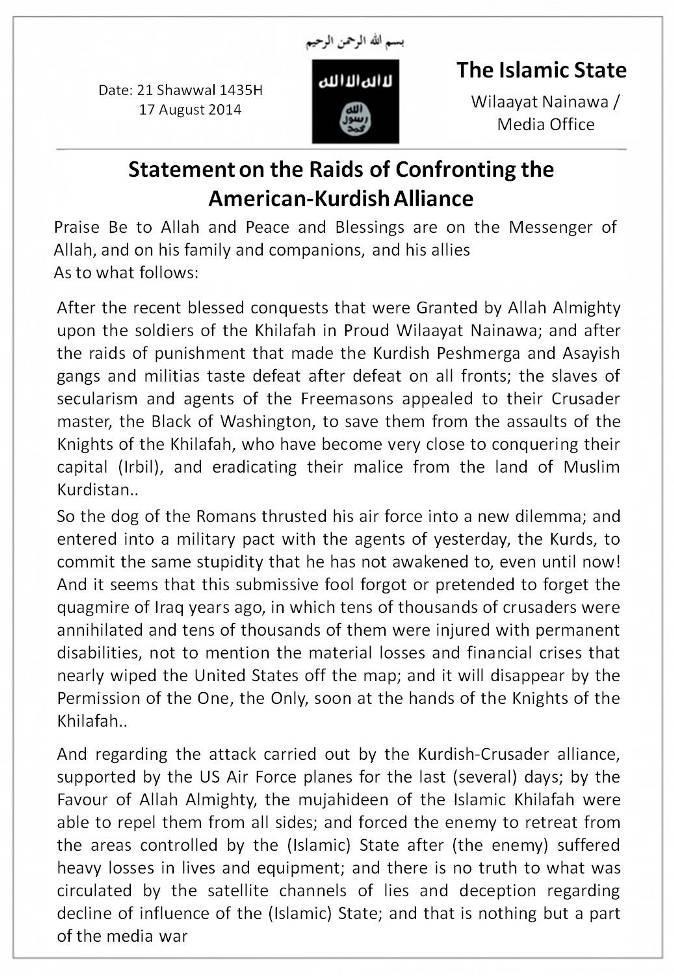 The Islamic State has issued an English statement on the US airstrikes & Peshmerga operations in northern #Iraq: pic.twitter.com/71pMdXrRXg