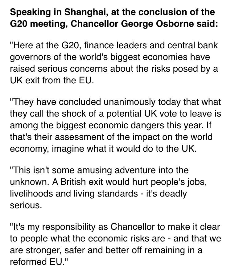 G20 says Brexit would be among the biggest economic dangers this year. Comments from @George_Osborne: pic.twitter.com/PUxfzTEitq