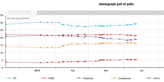 The state of the poll of polls in Spain. Via @Electograph. Rajoy apparently managing to wear the other three down.