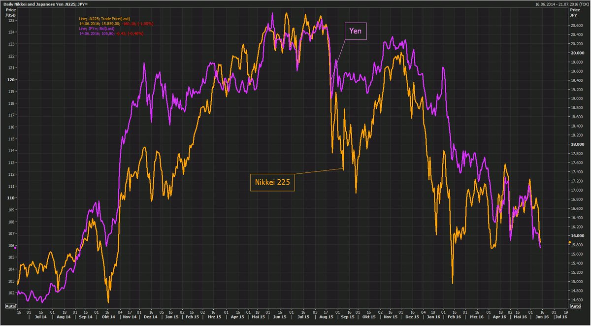 Japan's Nikkei drops another 1.0% to 15859.00 as #Brexit fears spur safe haven flows and drive Yen beyond 106.