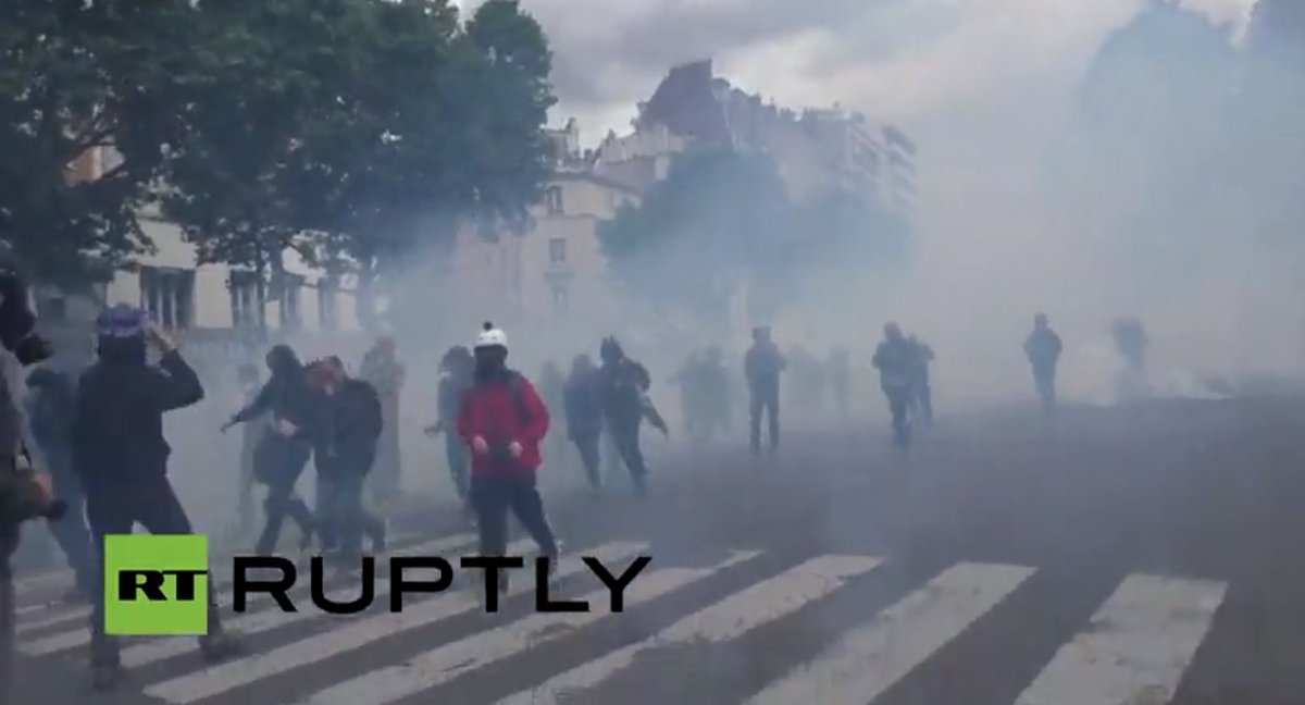 WATCH: Tear gas in #Paris amidst anti-labor reform protest https://www.rt.com/on-air/paris-labour-reform-protesters/ … #LoiTravail #manif14juin