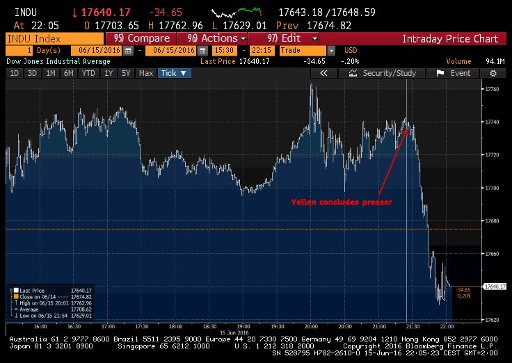 US index Dow Jones plunges just after Yellen has finished Fed press conference. Ends down 34.65 at 17,640.17.
