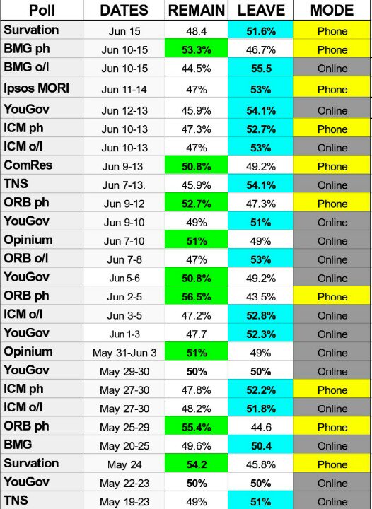 Final BMG/Herald poll, phone, UK: Remain 53%, Leave 47% (also online R45%, L55%, but BMG says phone more accurate) http://www.bmgresearch.co.uk/bmgherald-final-eu-referendum-poll