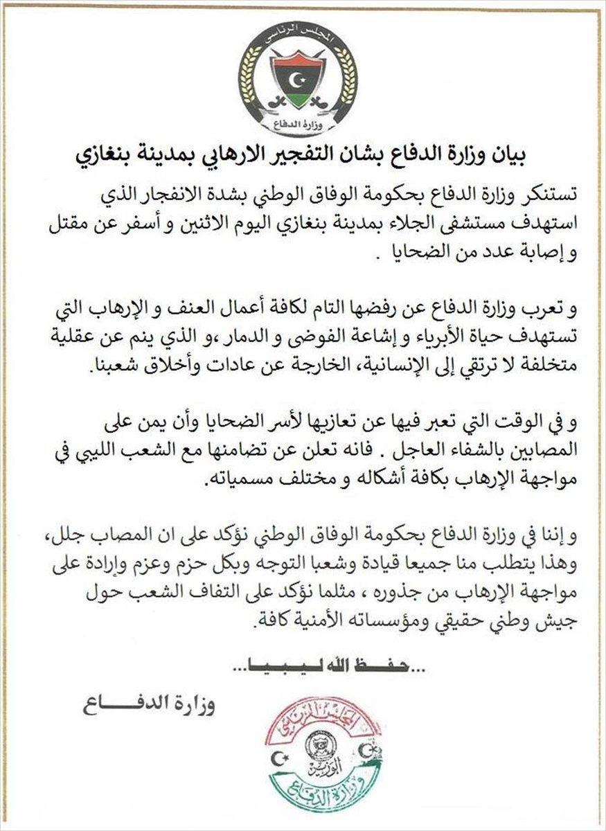 #Libya Unity Govt Defense Ministry condemns car bomb attack in #Benghazi.