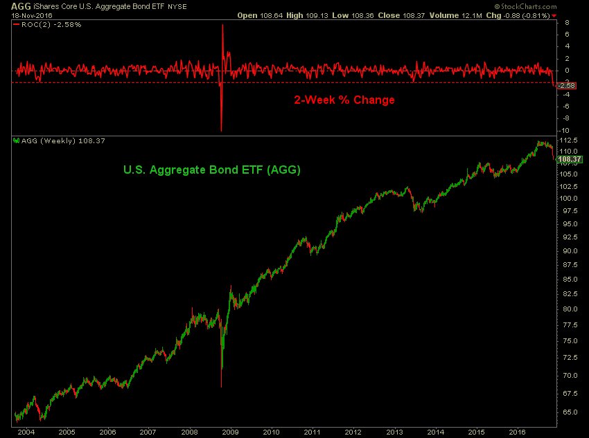 Largest bond ETF with over $41 billion in assets fell 2.6% over past 2 weeks. Only Sep '08 saw larger decline. $AGG