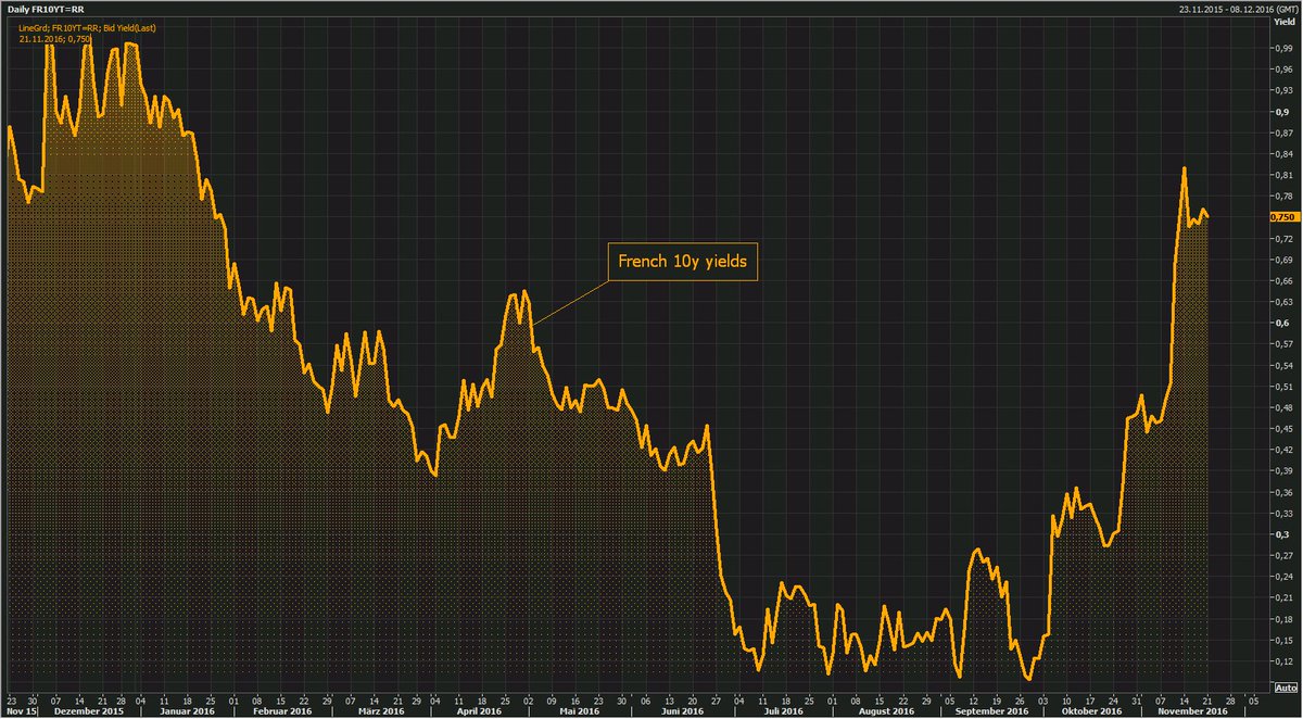 #France's 10y yields drop, outperform other Eurozone markets, as Thatcherite reformist Fillon front runner in France's 2017 pres election.