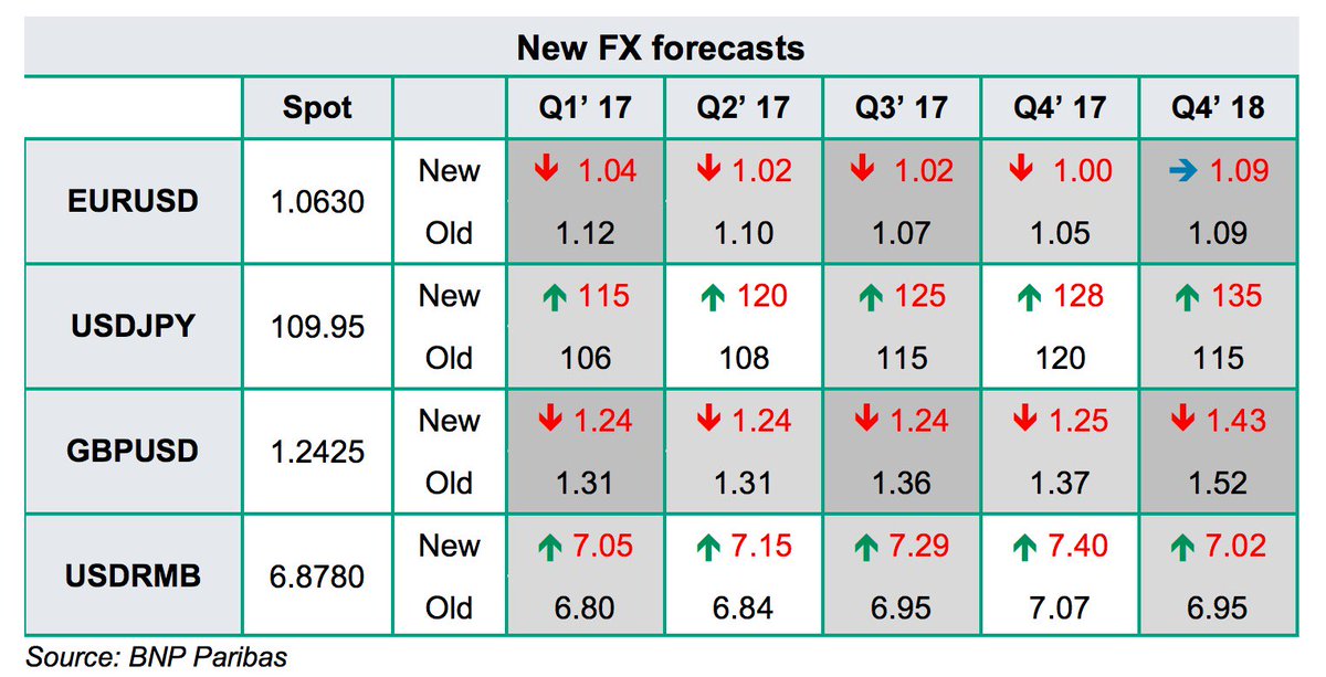 BNP ups Dollar forecast in response to Trump victory. Sees most upside vs Yen. Expects Euro to drop to parity by 2017 on CenBank divergence.