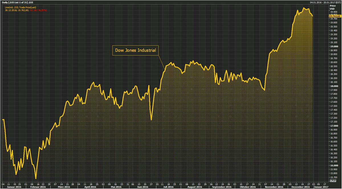 Dow Jones Industrial ends the year 2016 up 13.42% despite stunning surprises after -2.2% in 2015, best year since 2013.
