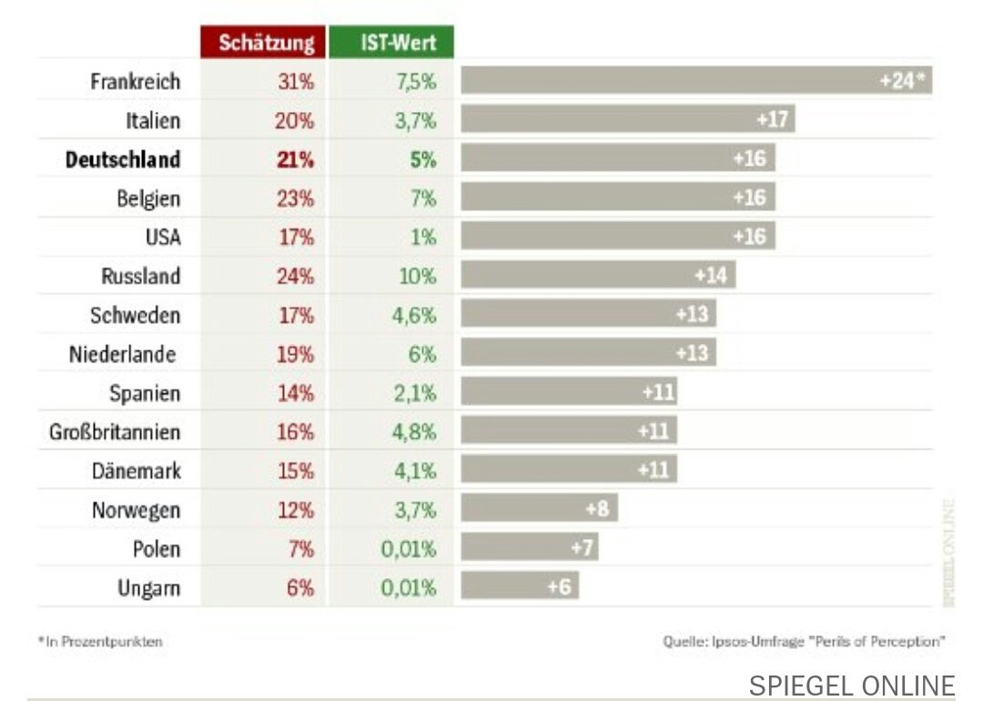 Germans think that 21% of the German population are Muslims. Truth is that it's only 5%. Numbers for France even more surprising.