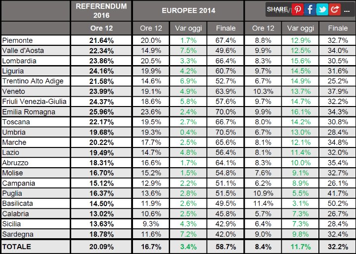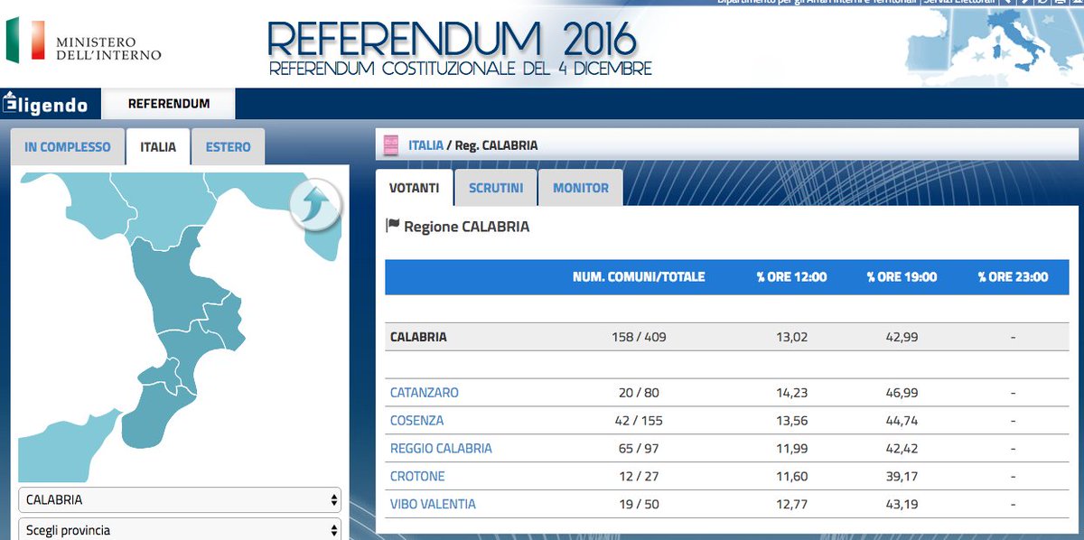 Italy referendum 7 p.m. turnout lower than average in the south. Calabria here 43% vs. 56.3% national.
