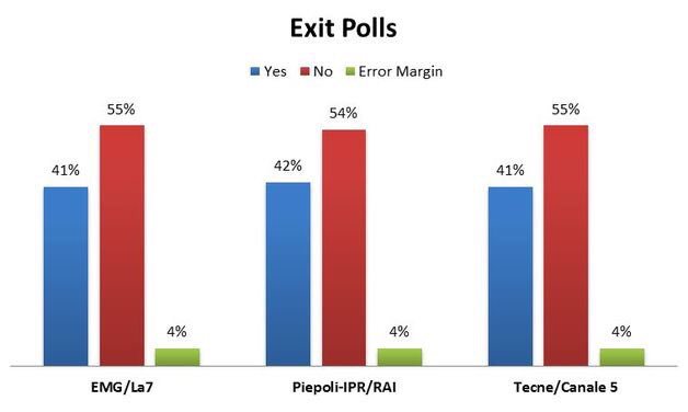 All three exit polls in Italy's referendum suggest a clear No vote.