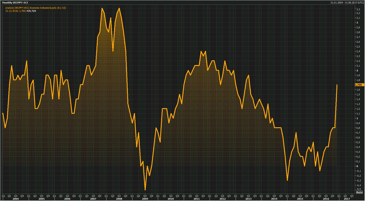 Oops. #Germany inflation rises to 1.7%, highest since 2013. Energy and food consist of most of the increase.