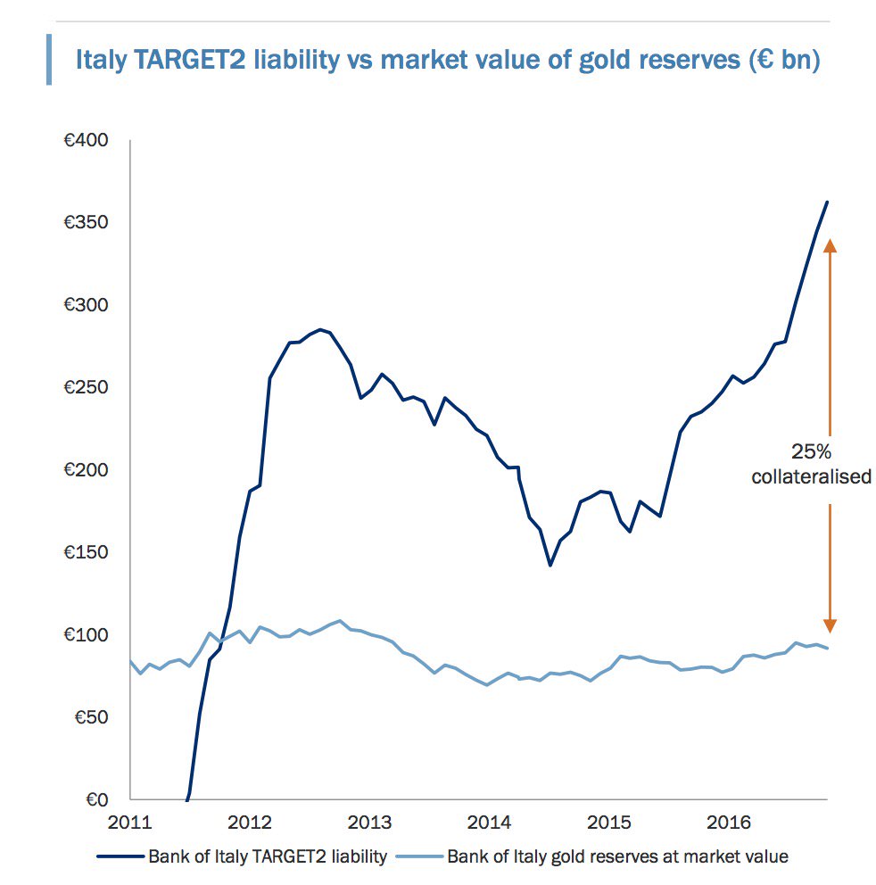 25% of #Italy's Target2 liabilities collateralized by gold. Gold reserves used by Bank of Italy in 1976 to guarantee Buba loan (viaAstellon)