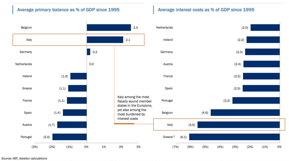 Legacy problem: #Italy among most fiscally sound member states in Eurozone, yet also among most burdened by interest costs. (via Astellon)
