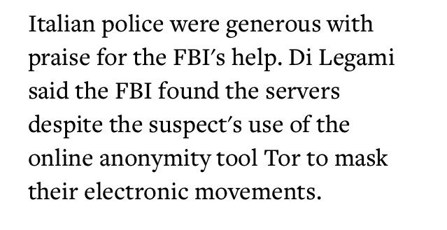 Another point of interest. Italian police say the FBI was able to help unmask the pair despite their use of Tor. FBI won't say how.