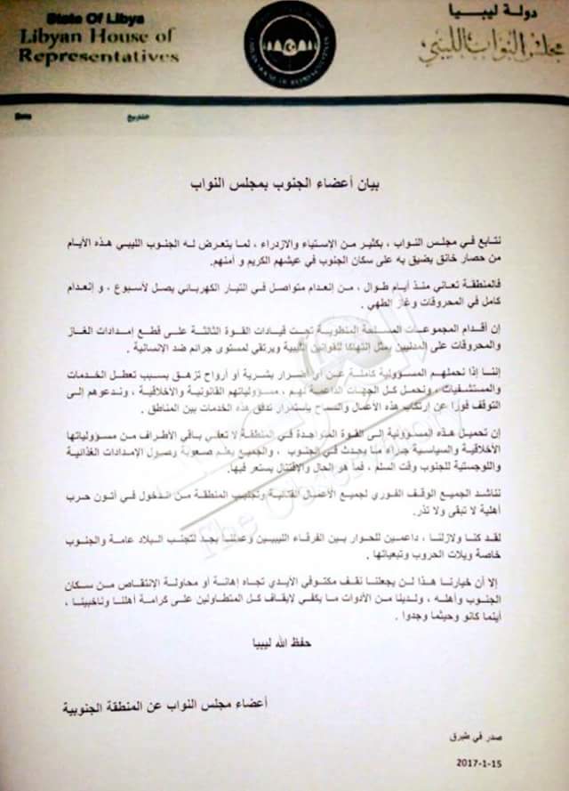 MPs: We still support dialogue between Libyan factions...and call on all to stop armed action to spare the South the outbreak of civil war