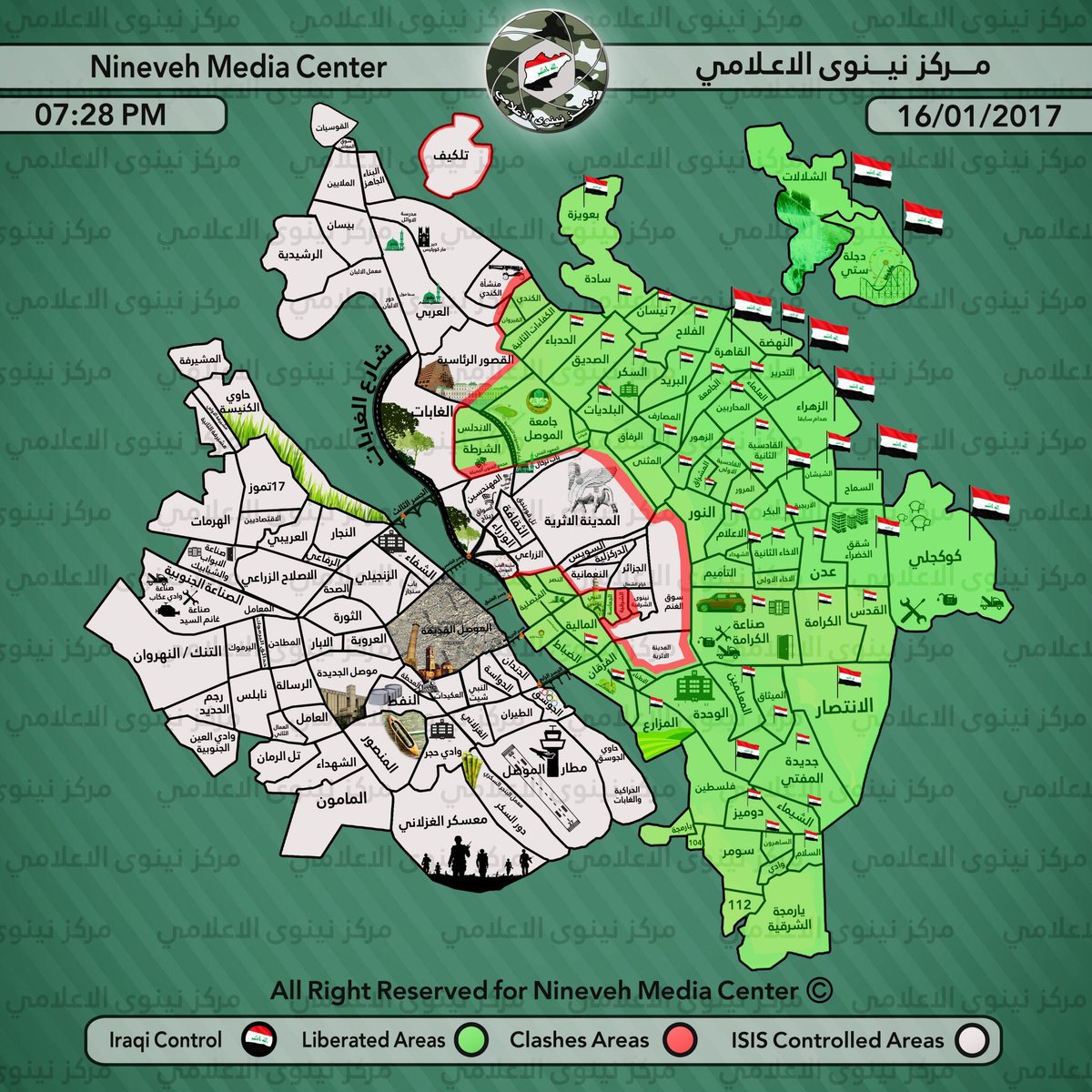 Latest #Mosul map showing #Iraq security forces control (in green): few more districts to go. Map via @NinevehMC #Iraq.