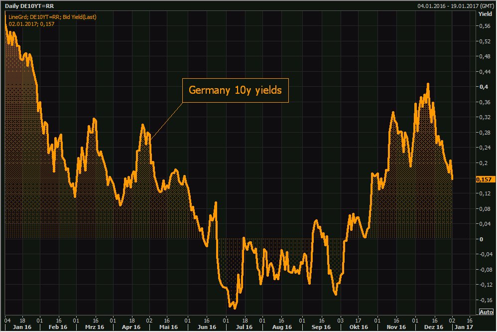 Bond and stock markets starting higher to the year. #Germany's 10y yields drop to 0.157%, lowest in 8 weeks.