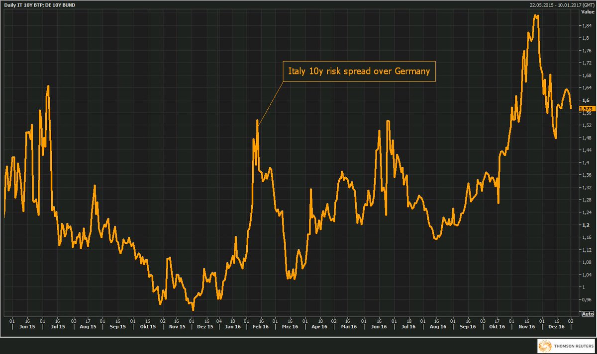 #Italy assets starting buoyant to the new year. While FTSE MIB trading 1.5% higher, 10y Italy risk spread over Germany shrinking to 157bps.