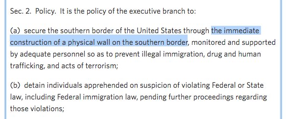 Here's Trump's wall in the executive order: "…the immediate construction of a physical wall on the southern border".