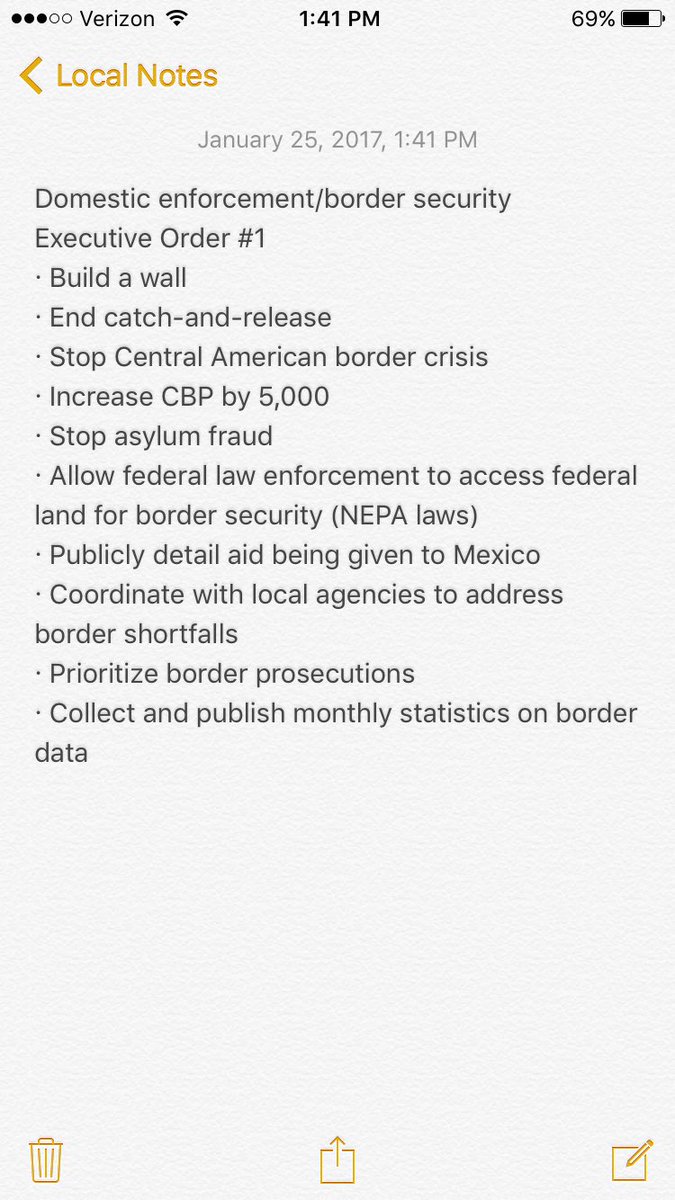 One executive order Trump signed just now is on "enforcement/border security" -- build a wall, end catch-and-release and other matters.