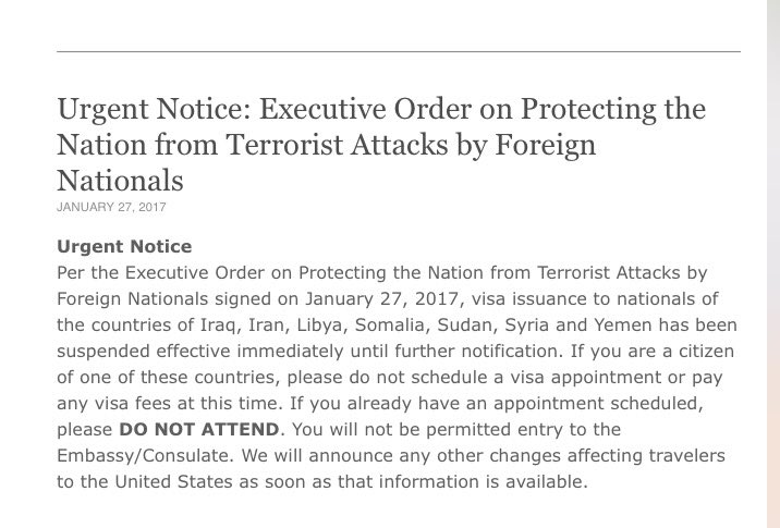US consulates just updated their websites, telling visa holders & applicants from Iraq, etc: appointments now cancelled. @NPR @janearraf