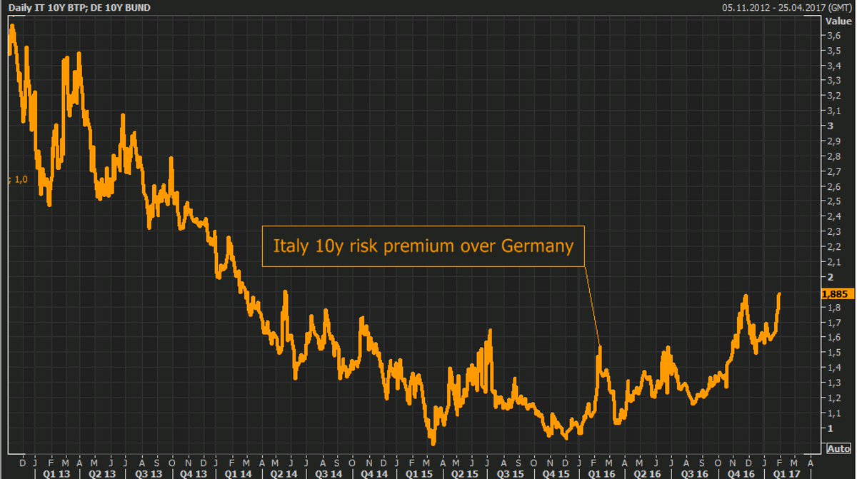 #Eurozone centrifugal forces keep rising. Italy 10y risk premium over Germany jumps to highest in 3yrs.