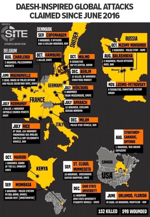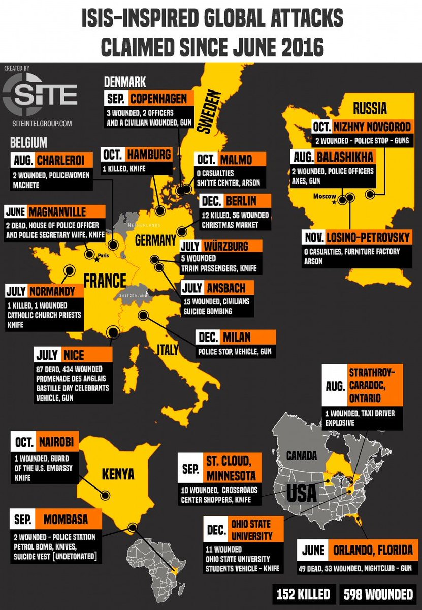 En 6 mois depuis juin 2016 l'#EI a revendiqué 11 attentats en Europe dans 6 pays (Fr, All, Be, Ita, Dan, Se) faisant +100 morts +500 blessés