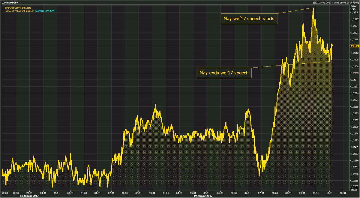 Market's verdict of May' #wef17 speech not very friendly: Pound has lost some ground as her speech was way below expectations.
