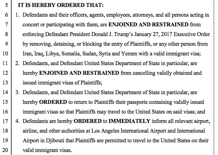 Just confirmed: Fed'l judge in Los Angeles (CD Cal) issued TRO barring removal, detention, or blocking entry under visa part of Trump's ban.