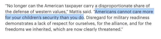 Another Mattis quote for NATO allies: "Americans cannot care more for your children’s security than you do".