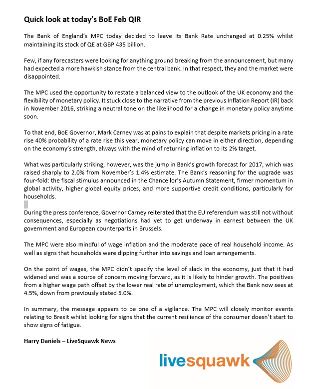 BoEs Feb QIR - MPC stance unchanged but see risks to inflation 'trade-off' rising. Not the hawkish shift in stance expected.@Livesquawk