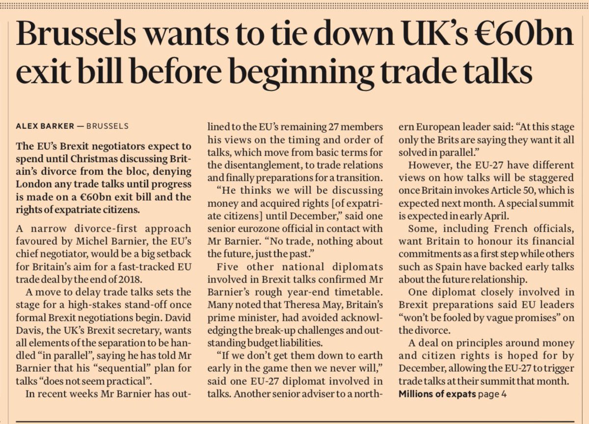 #EU wants to tie down UK's €60bn exit bill before beginning trade talks. http://on.ft.com/2lYeROL /via @FT /ht @hendopolis #Brexit