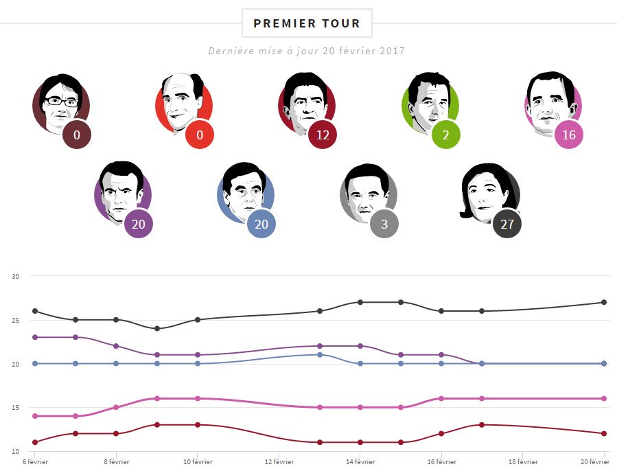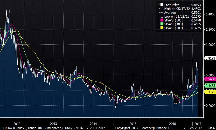 French 10Y Bund spread widest since August 2012 after Le Pen breaks 40% ceiling versus Macron and Fillon in polls for run-off vote