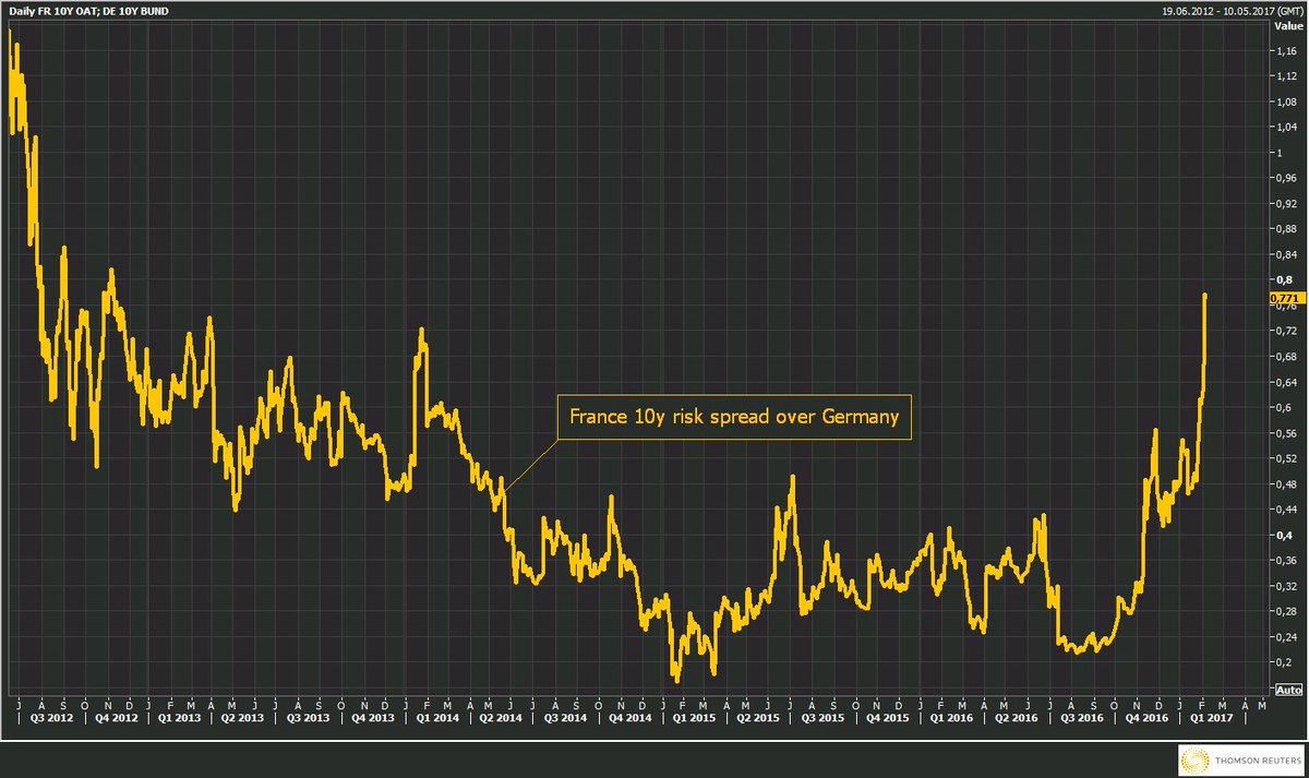 #France 10y risk spread over Germany keeps rising on increasing political risks in the Eurozone. Risk premium now 77bps, highest since 2012.