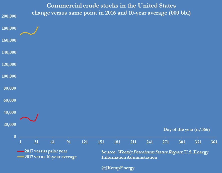 US COMMERCIAL CRUDE STOCKS are now +38 million bbl (+8.0%) higher than in 2016 and +183 million bbl (+56%) above 10-year average
