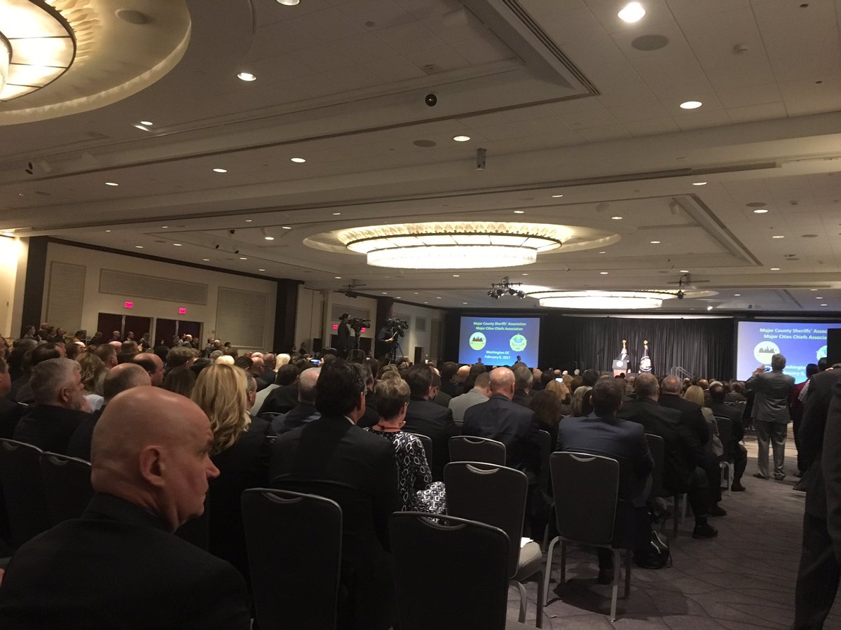 Polite, welcoming applause for President Trump's words at big-city chiefs and sheriffs' winter meeting, but fairly quiet reaction.