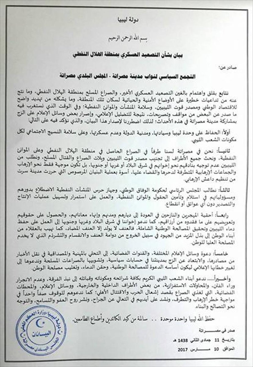 #Misrata Representatives & Municipal Council: We are not a party to the conflict occurring in #Libya's oil crescent