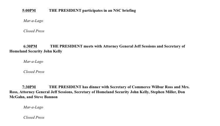 Updated sked: Trump having a NSC mtg today then meeting with Sessions and Kelly; then dinner w/Ross, Sessions, Kelly, Miller, McGahn, Bannon