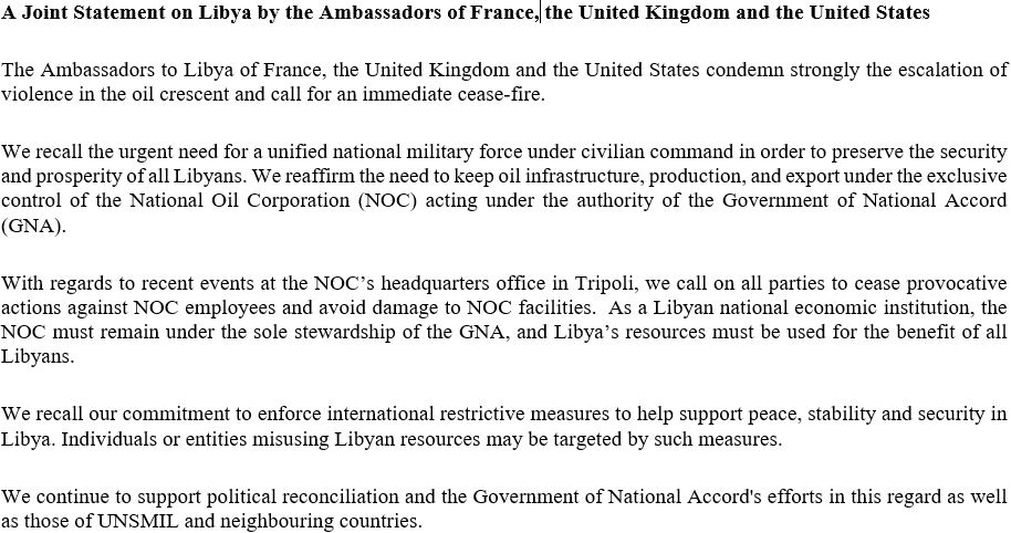 Joint Statement from France , UK & US Ambassadors on Libyan Oil Crescent developments.