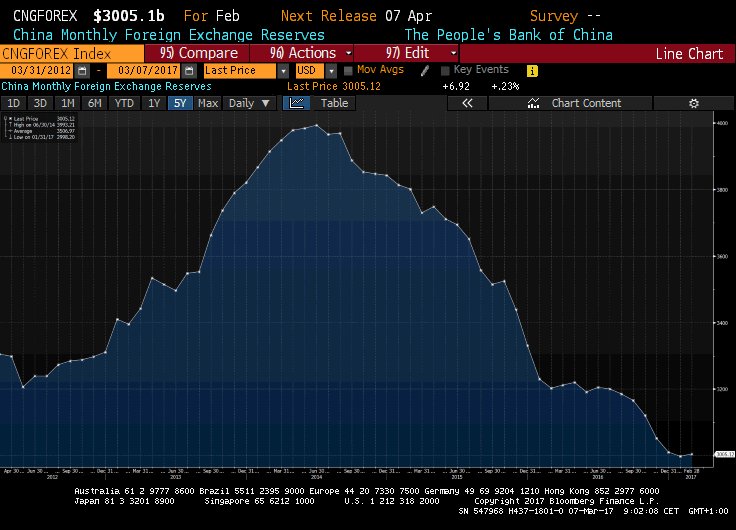 #China manages to increase their FX reserves back > psychological $3trn level. FX reserves rose to $3.0051trn in Feb, 1st rise since Jun2016