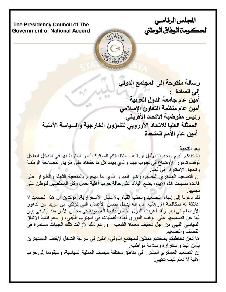 PM Serraj calls for international intervention to stop further escalation of violence in south Libya.