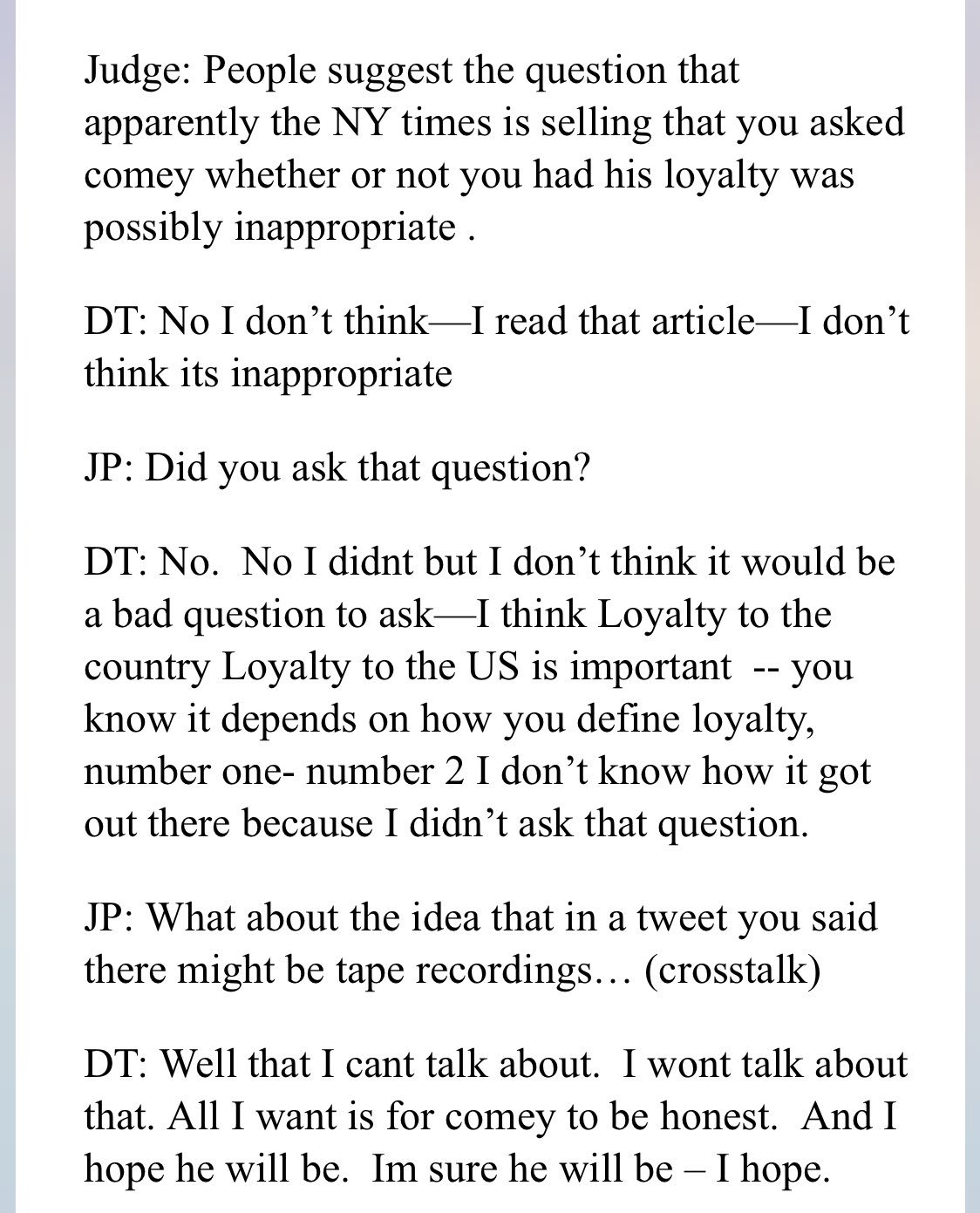 .@realDonaldTrump tells @JudgeJeanine he didn't ask Comey for loyalty pledge: pic.twitter.com/gEYJiAVa4V