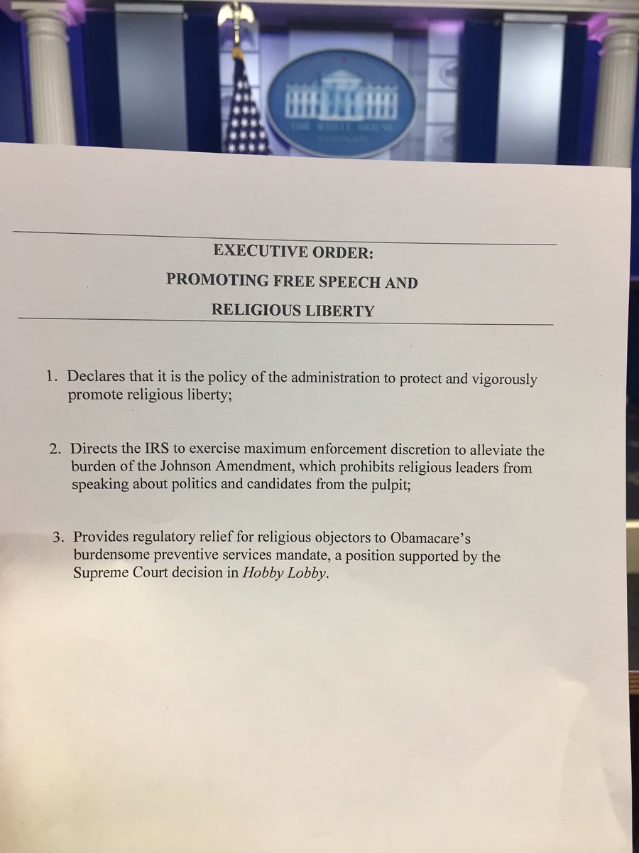 Here's the one-pager White House aides handed out in briefing room tonight on tomorrow's religious liberty executive order.