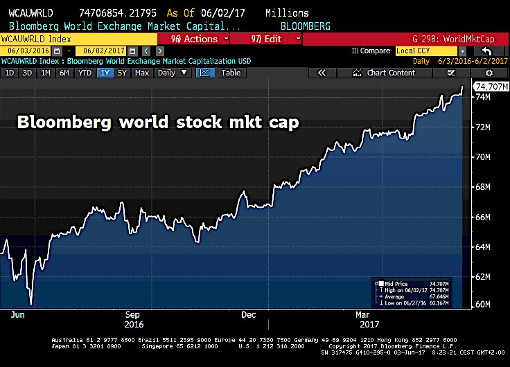 We've never had it so good: Global equities now worth $74.7trn, highest value in history. Equals to ~93% of world GDP.