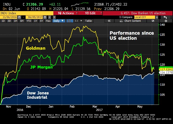 Looks as if Trump reflation trade just fake news. Wall St banks have lost 4% this week, have erased nearly all post-election outperformance.