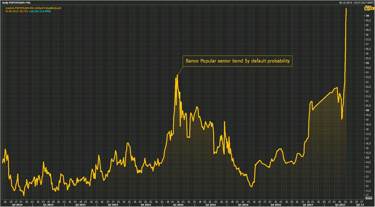 #Spain’s Banco Popular studying steps to bolster weakened liquidity as default probability even of sen bonds jumps. https://www.bloomberg.com/news/articles/2017-06-02/spain-s-banco-popular-said-to-study-measures-to-boost-liquidity-j3g7vw19 …