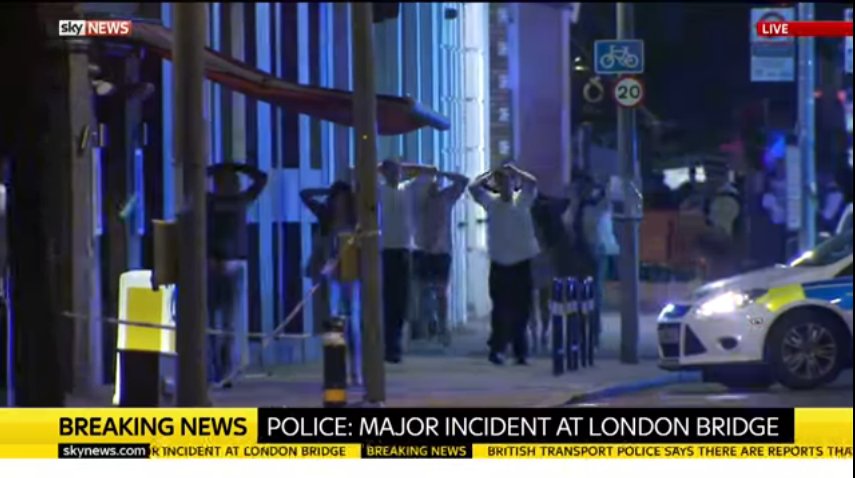 Police making people walk away from London Bridge area with their hands on their heads. This means they're still looking for attackers.