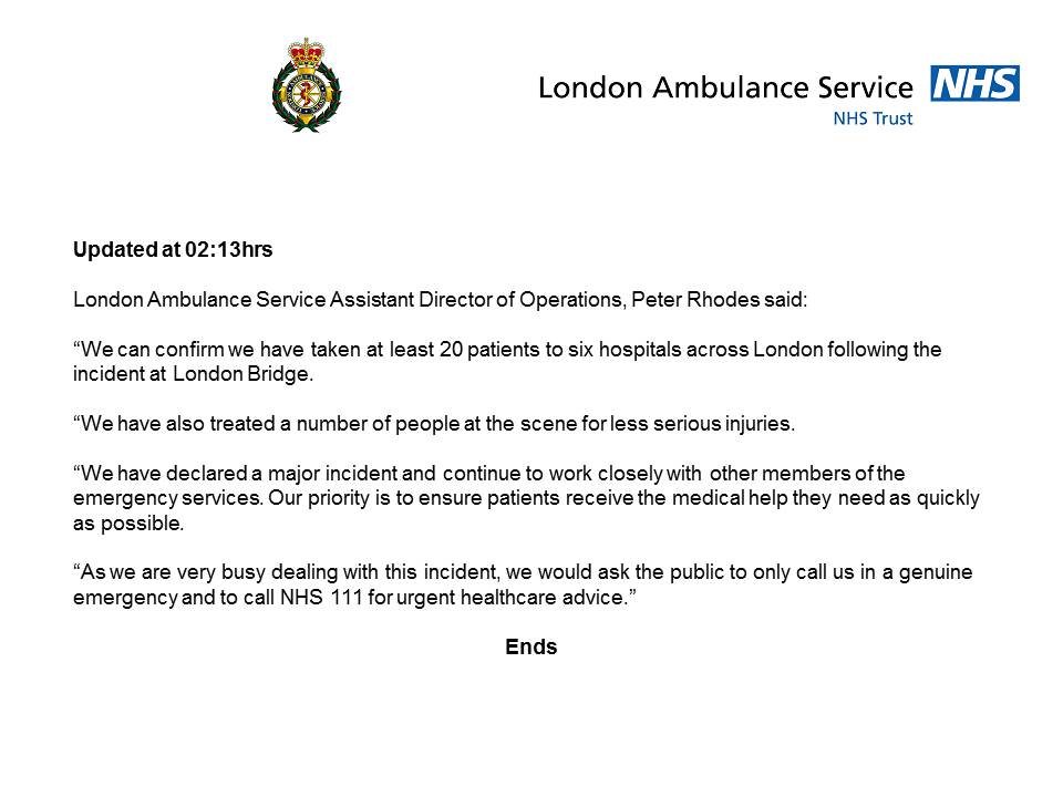 Our latest statement about the incident in #LondonBridge. We have taken at least 20 patients to six hospitals across London.