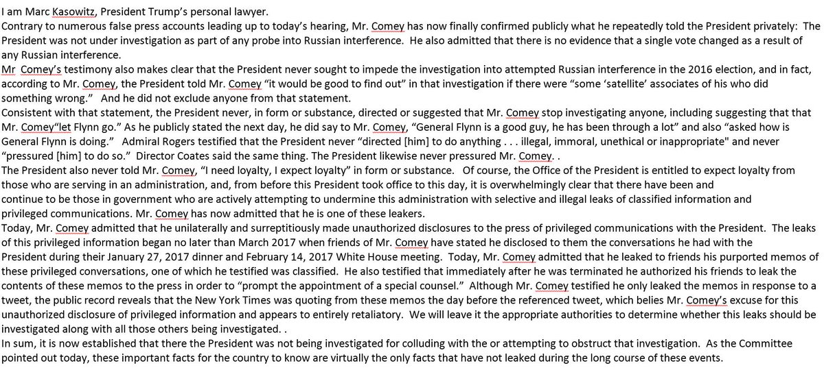 US Pres. Trump’s Personal Lawyer Kasowitz: Comey Testimony Confirms Trump Never Sought To Impede Russia Investigation – RTRS